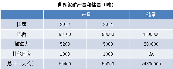根據(jù)美國地質(zhì)調(diào)查局2014年發(fā)布的數(shù)據(jù),全球鈮資源儲量超過430萬噸,并且分布相對集中,僅巴西一國鈮資源儲量就占到了全球總儲量的95%左右。